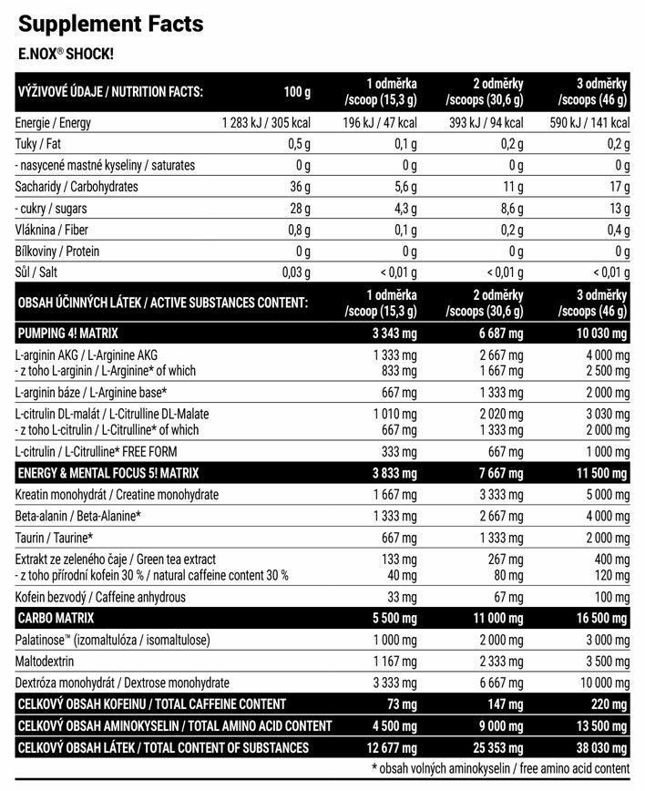 E.NOX SHOCK je napredni anabolizer jer stimulise NO proizvodnju (azot oksid) jedinstvenom kombinacijom: arginin alfa-ketoglutarat, arginin, citrulin i beta alanin (neesencijalna amino kiselina koja povećava proizvodnju karnozina u mišićnom tkivu). Takođe, E.NOX SHOCK sadrži tri oblika kreatina: kreatin alfa-ketoglutarat, koji je popularan sastojak zahvaljujući svojoj izvrsnoj apsorpciji i iskoristljivosti i veoma je potentan, tri-kreatin malat i kreatin etil ester. Ova trosmerna kombinacija kreatina će osigurati maksimalnu energiju za trening i maksimalan oporavak posle treninga. Da bi se postigao maksimalan fokus i intenzitet tokom treninga, E.NOX SHOCK sadrži stimulante kao što su: taurin, kofein, ekstrakt zelenog čaja. Efekat je multipliciran sadržajem ugljenih hidrata – eksluzivno Palatinozom (izomaltuloza) sa jedinstvenim svojstvima: nizak glikemički indeks ali brzo oslobađanje jedinica glukoze; maltodekstrin i dekstroza kao brzi izvori energije. Ova kombinacija će osigurati dovoljno energije tokom treninga i čini kreatin komponente potentnijim. E.NOX SHOCK je instant prah sa odličnim ukusom.