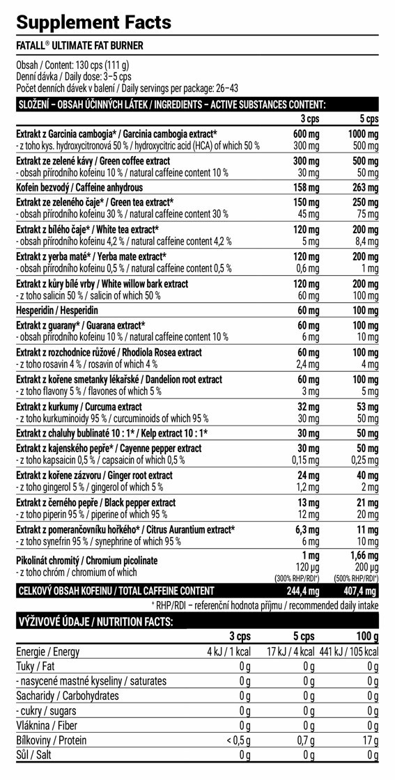 Fatall Ultimate Fat Burner je moćan i efikasan sagorevač masti, koji je dizajniran za efikasno razbijanje rezervi masti. Dizajniran je za fitnes trenere i vrhunske sportiste. Naravno, može ga koristiti i nesportska javnost i svako ko želi da smanji zalihe masti i telesnu težinu. Fatall (R) Ultimate Fat Burner sadrži ukupno 18 aktivnih supstanci sa sinergističkim (međusobno podržavajućim) efektom, to je najsloženiji sastav na trenutnom tržištu! Sastav i opis svakog aktivnog sastojka pogledajte ispod i uverite se sami.