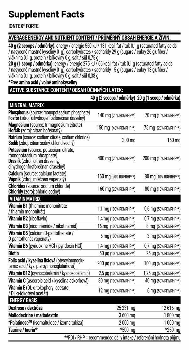Iontex Forte je univerzalni sportski napitak izuzetnog ukusa, koji možete piti tokom bilo kog treninga. Naročito je pogodan za dugotrajne treninge, gdje se gubi dosta tečnosti putem znojenja. On obezbjeđuje dovoljnu hidrataciju, energiju i neophodne vitamin i minerale. Iontex Forte sadrži 3 balansirana izvora ugljenih hidrata: dekstrozu, maltodekstrin i izomaltulozu (Palatinoza), taurin-stimulativnu supstancu, koja unaprijeđuje vaše performanse i balansiran kompleks vitamina i minerala.