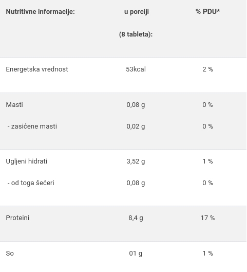 * PDU = preporučeni dnevni unos na osnovu prosečnog unosa od 8400 kJ / 2000 kcal dnevno