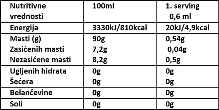 Preporučena upotreba: Lagano promućkajte bočicu prije upotrebe. Ulje se prska na otprilike udaljenost od 20 cm direktno na hranu prije ili posle kuvanja prema ukusu.