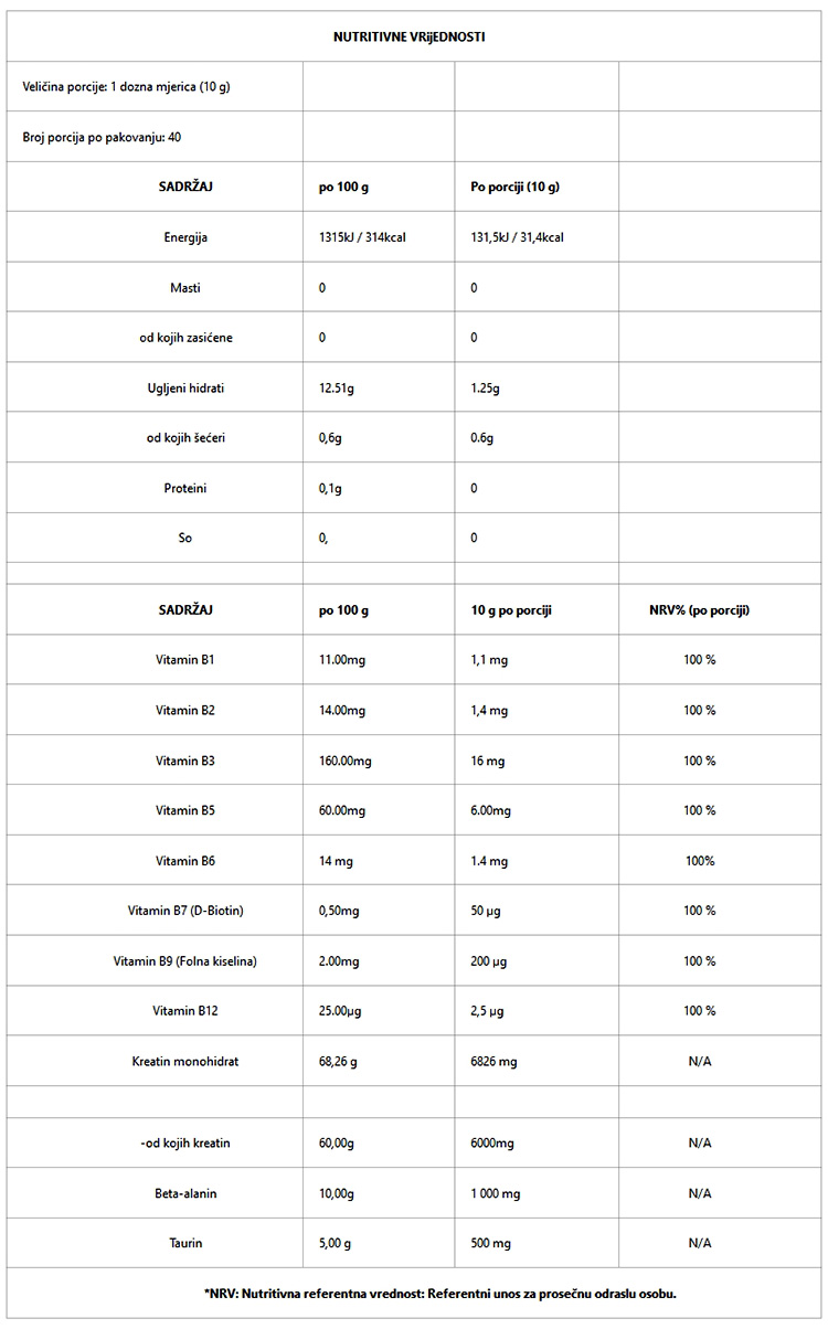 Odlični rezultati koje vašem sportskom učinku pruža ovaj preparat mogući su zahvaljujući dodavanju doze beta-alanina, taurina i vitamina koji smanjuju umor i pritom povećavaju dejstvo kreatina. Ovako napravljen kreatin kompleks omogućava uspješno izvođenje i najintenzivnijih vježbi u teretani tako što povećava kontrakcije mišića i unapređuje metabolizam ćelija.