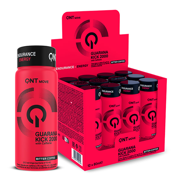 GUARANA KICK je supplement bez šećera, sa visokim sadržajem kofeina i guarane, koja može pomoći svim aktivnim ljudima da savršeno prelaze izazove svakodnevnog života. Bez obzira da li ste aktivna osoba i potreban vam je dodatni podsticaj da briljantno završite svoje dnevne zadatke, osoba koji ide u teretanu ili neku drugu aktivnost nakon cijelog dana na poslu, ovo je pravi proizvod za vas! Visoko koncentrisana formula QNT GUARANA KICK SHOT sadrži ekstrakt kofeina i guarane, tropskog biljnog sastojka koji su Indijci Amazonske šume koristili vijekovima zbog svojih fantastičnih svojstava. QNT GUARANA KICK SHOT dolazi u malom, jednostavnom za nošenje paketiću koji omogućava bilo kome da ga koristi bilo gde, bilo kada u toku dana. Napravljena je sa jednostavnom, ali vrlo efektivnom formulom i ukusom gorkog kafe. Možete probati ujutru sa svojim doručkom da biste započeli svoj dan, ili možete popiti popodne da vam pomogne da završite planirane zadatke. Koristi se prije treninga kao jednostavan ali efikasan dodatak za trening, kada god osetite potrebu za dodatnim povećanjem energije. Izuzetno niska količina kalorija, čini ga pogodnim i za ljude na vrlo strogoj ishrani. Zbog stimulativnih efekata kofeina i Guarane, preporučujemo da ograničite upotrebu ovog suplementa kasno popodne, kako biste izbjegli probleme s spavanjem. Ovo je naročito važno ako i vi pijete kafu.